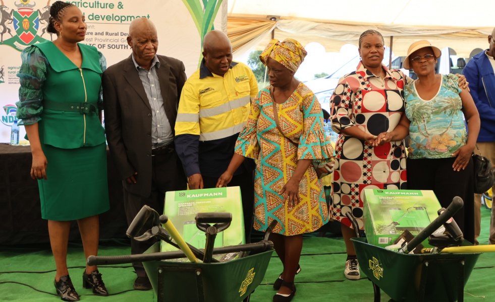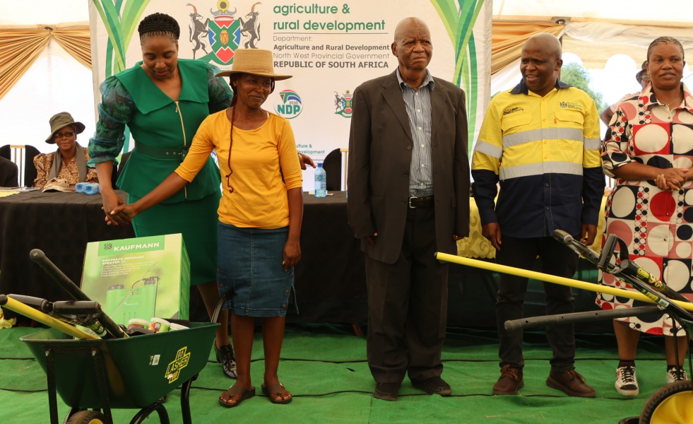 The handover ceremony of essential tools, led by the MEC for Agriculture and Rural Development, Hon. Madoda Sambatha, was attended by the MEC for Social Development, Hon. Susanna Basetsana Dantjie, the Chair of Chairs, Hon. Tebogo Modise from the Provincial Legislature, as well as the traditional leadership of Kabe represented by Kgosana Keesilwe Mokgosi.